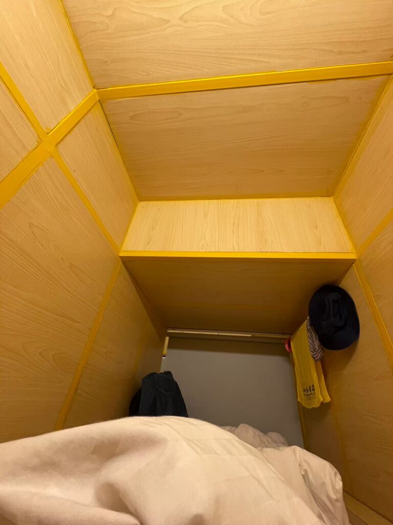 男女混合ドミトリー。昨日と同じくカプセルタイプのベッド。コンセントもWIFIもしっかりあり!