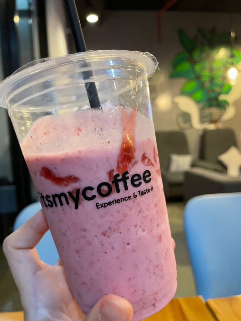 ちょっとカフェで休憩。いちごのスムージー。